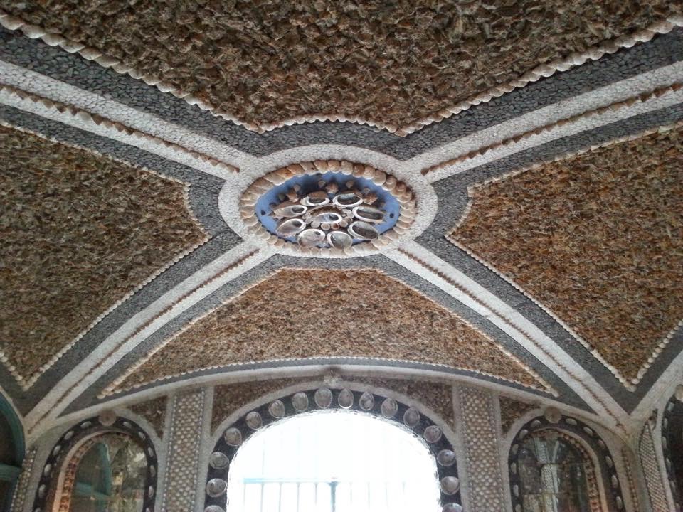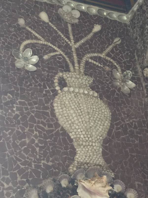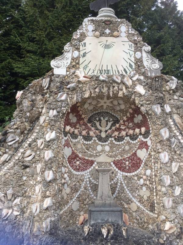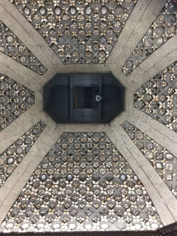 3) Een schelpengalerij onder een kleine waterval tegenover het kasteel. Dit is een kleine waterval die je vanaf het kasteel kan zien liggen. Onder die waterval bevindt zich een holte die met schelpen versierd is. Deze ruimte is een echte schelpengrot, want het lijkt op een natuurlijk gevormde ruimte.