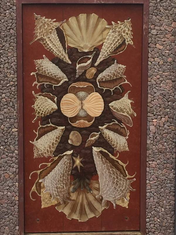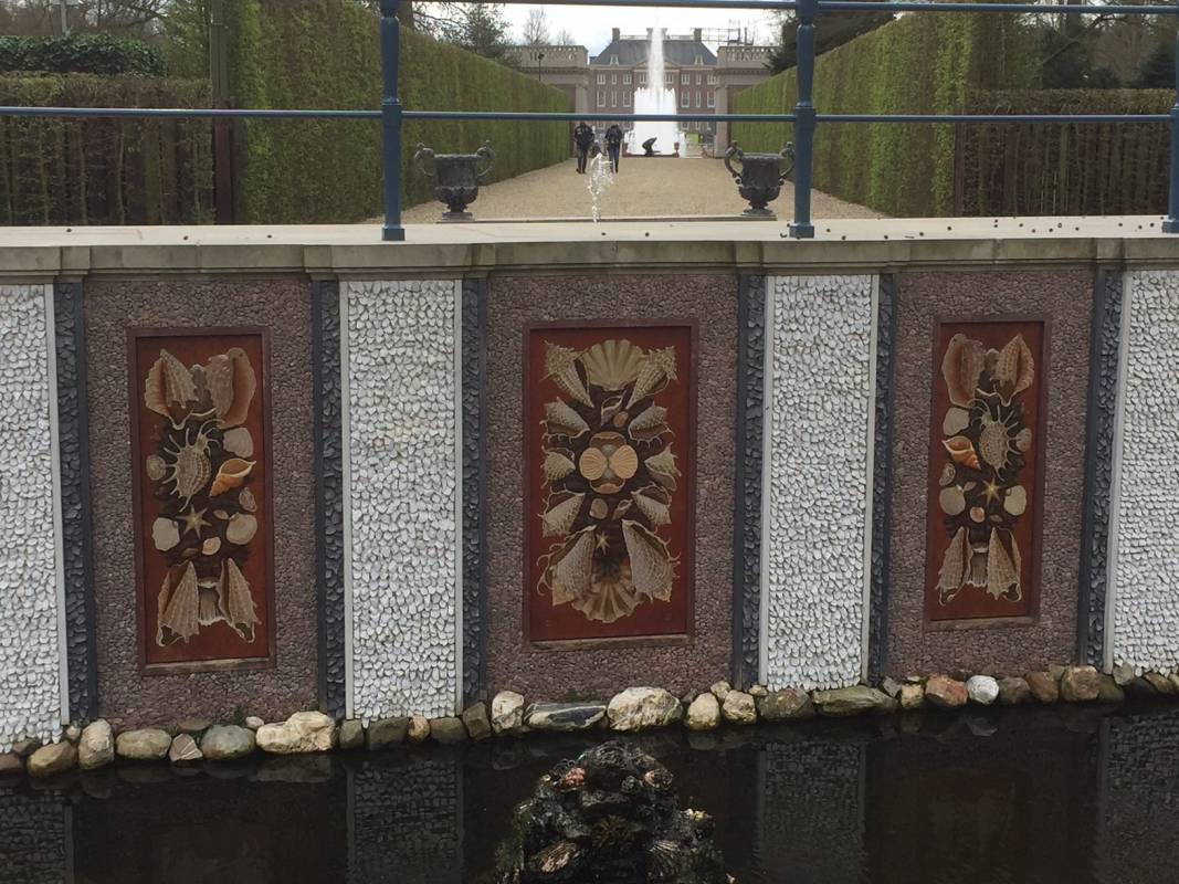Beneden in het Paleis een Schelpengalerij, maar ook buiten, aan de achterkant van de Paleistuin, liggen enkele schelpen ornamenten uit zicht