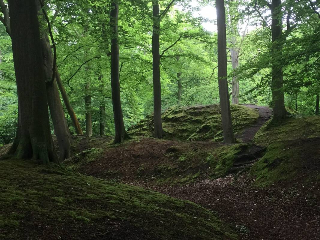 Het was voor ons toch wel even zoeken, maar veel omwonenden kennen de feeërieke heuvelachtige plek in het bos, die naast de A44 ligt gescheiden door enkele struiken en bomen, in de buurt van het theehuis op een heuvel.
