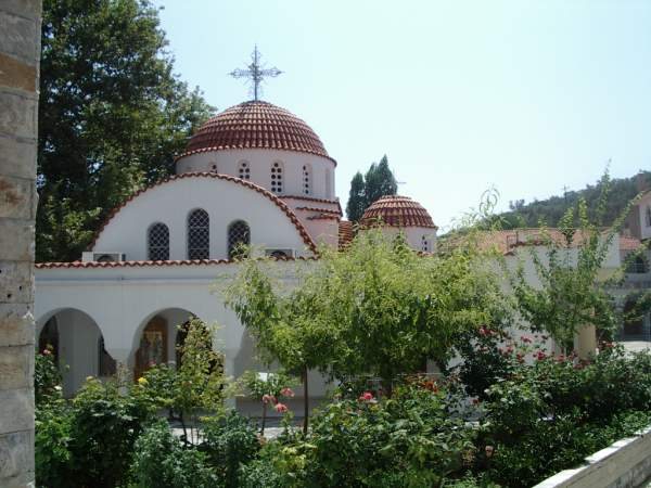Er waren op deze plek eerder resten gevonden van een nonnenklooster uit de 13e eeuw op de heuvel van Karyés, wat toen gewijd was aan Moeder Maria. De toenmalige Moederoverste, Olympia, werd rond het jaar1235 na Christus hier vermoord door piraten toen zij het klooster volledig vernietigden. Vanaf het midden van de 15e eeuw leefden hier monniken in een kluizenaarshut, die als heremiet leefden en later Heilig werden verklaard. Voor hen werd hier eeuwenlang bovenop de heuvel, op dinsdag na Pasen, op ceremoniële wijze bij een Altaar een Heilige Mis opgedragen.