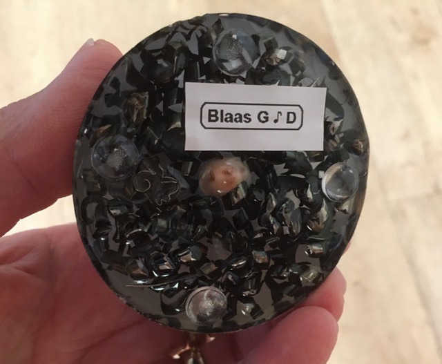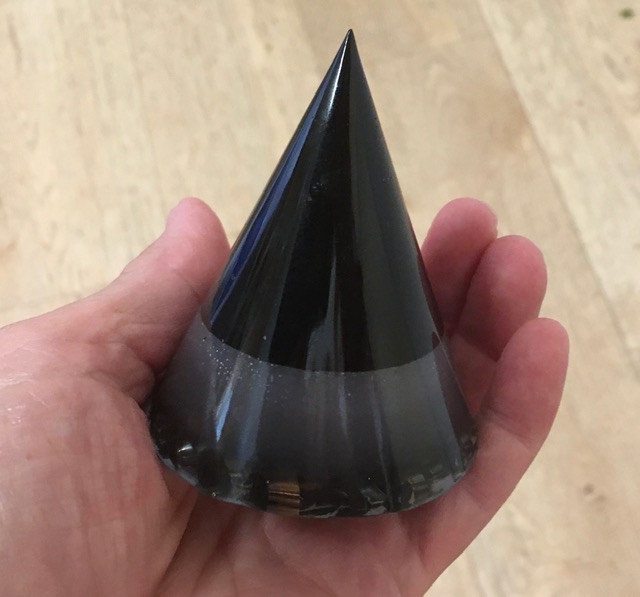 Deze Orgonite Piramide bestaat uit gestolde kunsthars met daarin een KOSMISCH AFGESTEMDE HEMATIET op een bedje van ijzerkrullen rondom een schelpje (uit La Lisla – Asturië – Spanje. De Solfeggio Klank Piramide is om klanken op te slaan en vast te houden, meerdere keren voorbereid tijdens het houden van Ceremoniële Klank Healing Activaties in de STERRENPOORT.