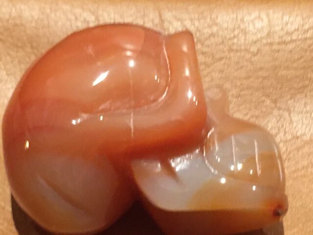 Deze schitterend vlammende oranje Carneool Hathor skull is door Maria Magdalena gecodeerd met de heilige Graal frequenties. Zij is een opwekkende godin en zal jouw D.N.A. muteren en verschonen van tegenwerking. Ze wil daarom graag dicht in je buurt (bv in een broekzak) zijn met haar hartverwarmende invloedrijke energie.