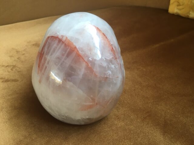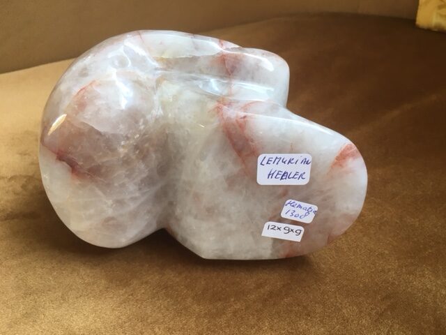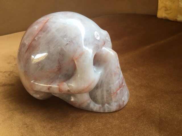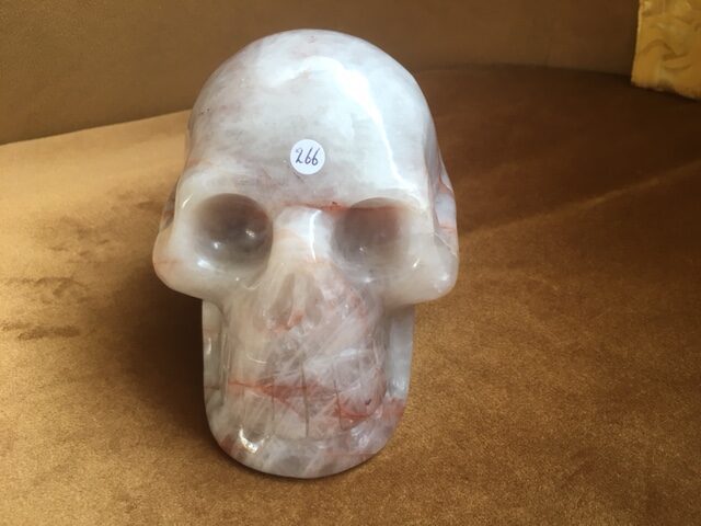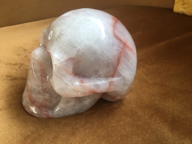 Deze skull van Bergkristal is rood oranje dooraderd met Hematiet insluitsels – ook Golden LeMUrian Healer kwarts of Harlekijn kwarts genoemd.
