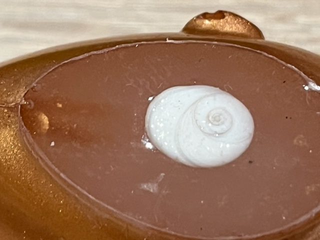 Deze vrolijk ogende Wit Seleniet, met daar overheen een goud-koper laagje, bevat een Shiva LeMUria Schelpje van het Spaanse Strand.