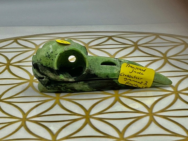 Deze bijzonder zeldzame steensoort Grossulaar Granaat wordt door haar groene kleur ookwel Transvaal jade of Afrikaans Jade genoemd, maar is dat niet.