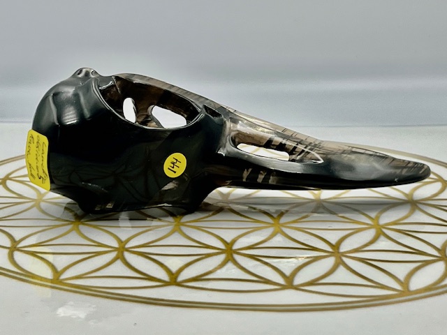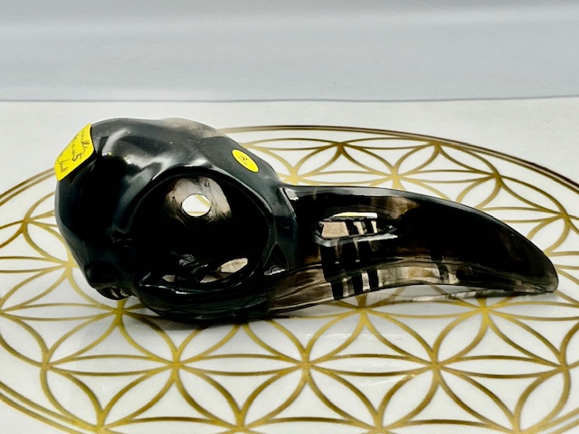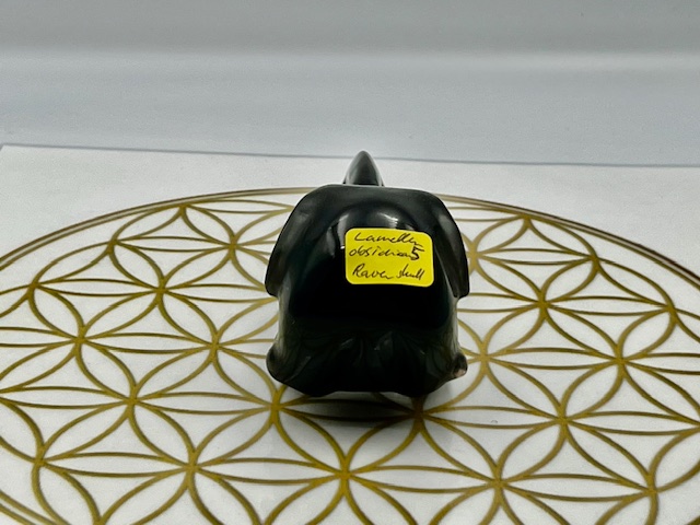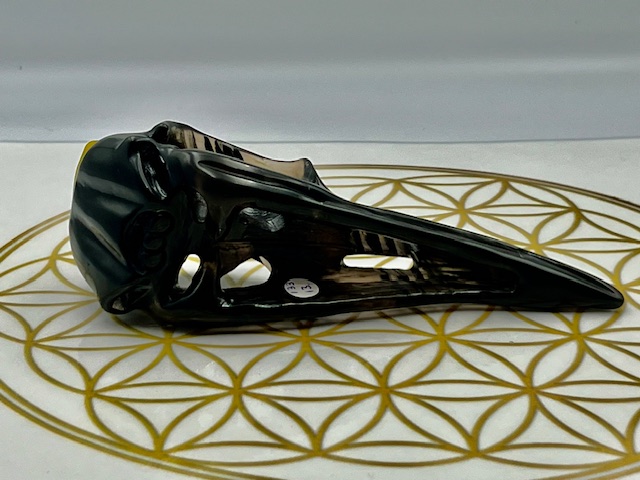 Deze raven schedel van lamel obsidiaan opent Poorten naar diepe bescherming, oeroude zielsherinnering en krachtige transformatie vanuit LeMuriaans bewustzijn.