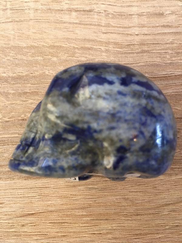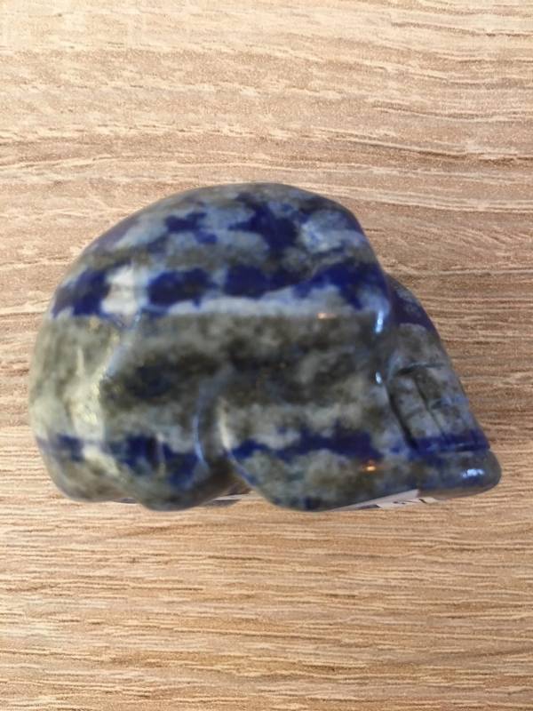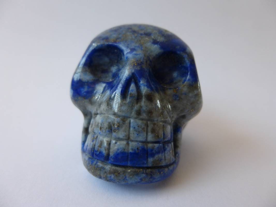 Deze blauwgrijze lapis lazuli Skull is licht gespikkeld met pyriet-deeltjes en kan vergeleken worden met een nachtelijke bewolkte sterrenhemel. Ze communiceert graag, zelfs ook nog in de late avond met haar Hoeder.