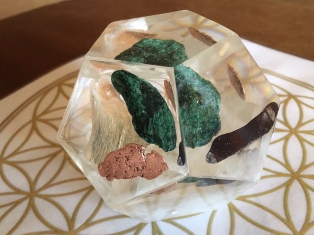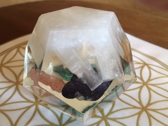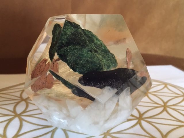 Deze in heldere kunsthars gegoten Dodecaëder stelt de binnen leefwereld van het Oude LeMUria voor. De bodem wordt gevormd door Wit en Oranje Seleniet en verder is haar kristalwereld opgebouwd uit groene Fuchsiet, Purperiet en Koper afkomstig van Venus. De combinatie van deze kristallen leefwereld leveren een perfect klimaat op vol zachte plantaardige trillingen om het Kosmische leven op te baseren.