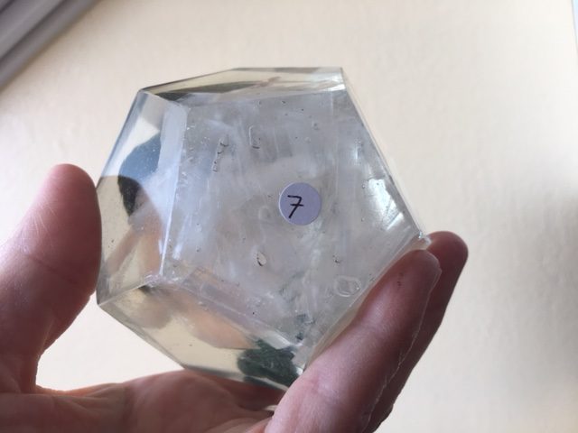 Het gaat om een pentagonale dodecaëder. De pentagonale dodecaëder is een regelmatig veelvlak, in dit geval 5-hoekig. En als je die in een bol zou plaatsten, dan raakt elke hoek de binnenkant van die bol.