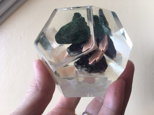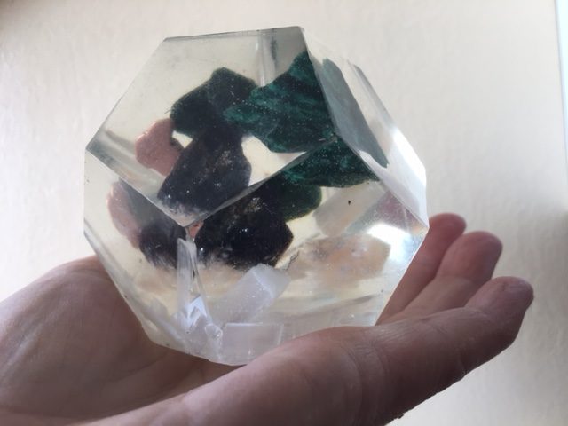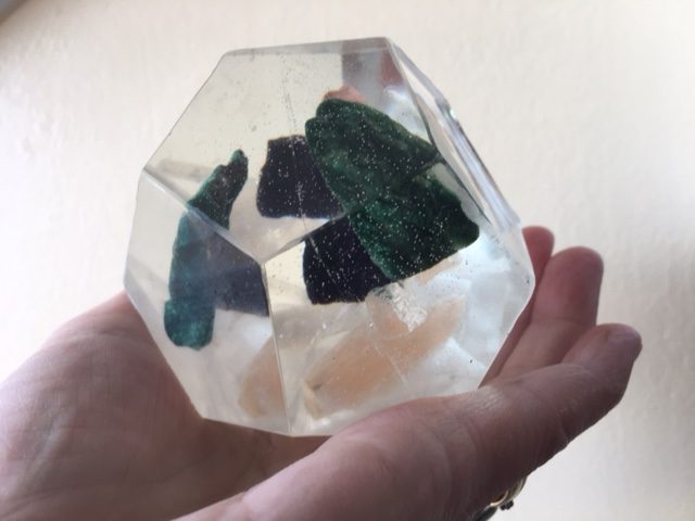 Deze in heldere kunsthars gegoten Dodecaëder stelt de binnen leefwereld van het Oude LeMUria voor. De bodem wordt gevormd door Wit en Oranje Seleniet en verder is haar kristalwereld opgebouwd uit groene Fuchsiet, Purperiet, Fuchsiet en Koper afkomstig van Venus. De combinatie van deze kristallen leefwereld leveren een perfect klimaat op vol zachte plantaardige trillingen om het Kosmische leven op te baseren.