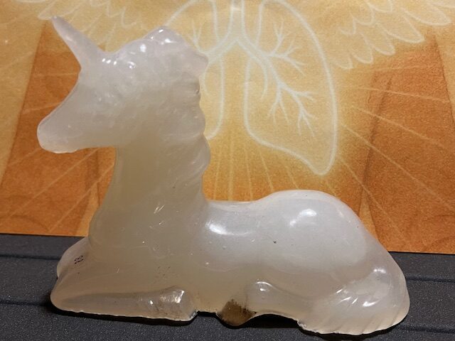 Tevens een Ideale Eenhoorn om ook mee op reis te nemen vanwege haar kunsthars omhulling, want normaal gesproken zou Seleniet veel te broos en kwetsbaar zijn. Nu is het bestand om bijvoorbeeld even geplaatst te worden in de natuur, langs de waterkant of bij een Boom die als oude Oerpoort dient.