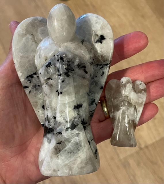 Deze schitterende LeMUria Regenboog Maansteen Engel Verlicht je Levenspad om je dromen en intenties tot uitdrukking te gaan brengen in de leven. Regenboog Maansteen bevat de Moederenergie van onze Moeder Maan en de Vrouwelijke Magische energie stroom van de Moeder LeMUria Natuur.