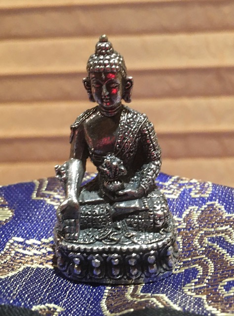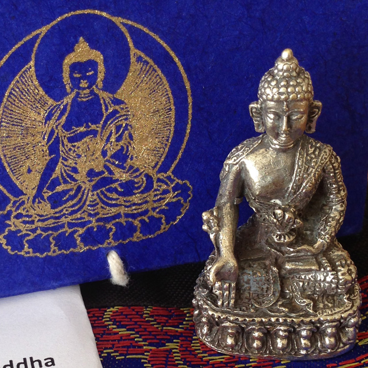 Inclusief luxe brokaten opbergzakje, blauw doosje en beschrijving van de Medicijn Boeddha.
