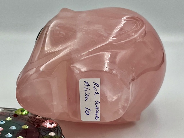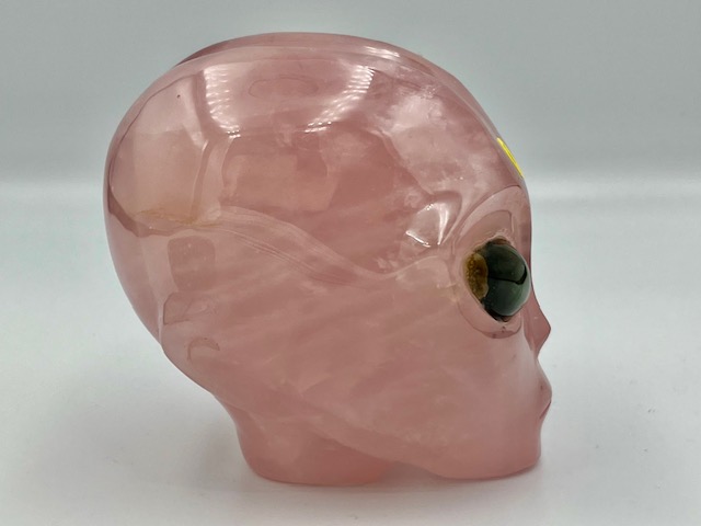 Rozenkwarts Alien Skull met Labradoriet ogen 10: 7.7×6.5×7.5 cm – 546 gr – VENUS afgezant
