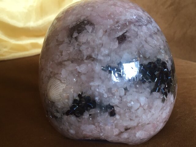 Dit komt omdat ze naast Rozenkwarts, ook doorspoelt en doordrenkt wordt met de Parel-liserende ElfSchelpen Trillingen uit de MoederBron van LeMUria. Zo bevat deze LeMUria Orgonite Moederskull ook aanvullend om de Kosmische aantrekkingskracht van helende energieën: Bergkristal, Hiddeniet, Amegreen en Blauwe IJzer spiralen.