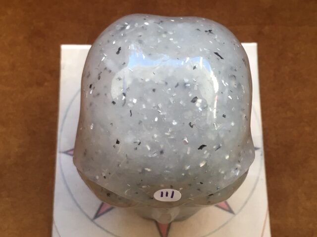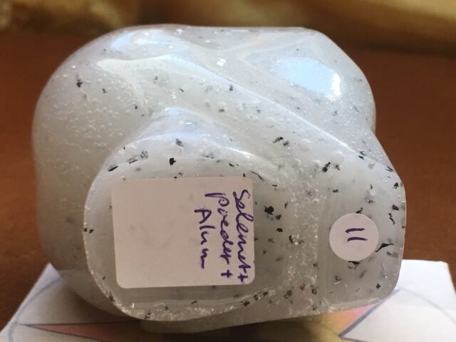 Seleniet heeft de wit zilver gouden LeMUria trilling van Moeder Maria en wordt ook wel Maria Steen of Glas genoemd en is een zachte Spirituele steensoort, welke ook beschermend en inzichtgevend i.c.m. het Aluminium zal inwerken op haar Hoeder. Het is een uitstekende skull om tussen je voeten te plaatsen als je mediteert. Het bevordert de eenheid tussen al jouw herinneringen die terug kunnen gaan tot en met de ondergang van LeMUria d.m.v. telepathie, divinatie (waarzeggerij) en mediamieke gaven.