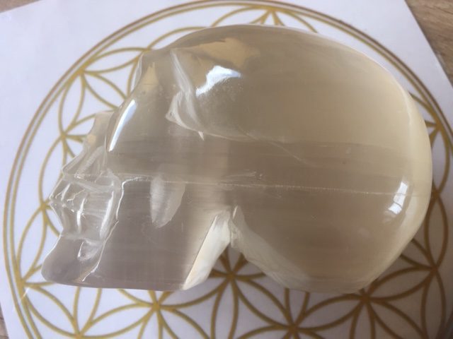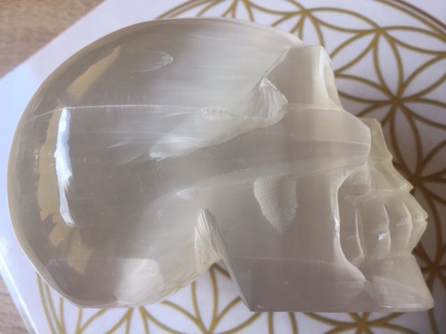 Seleniet heeft de wit zilver gouden LeMUria trilling van Moeder Maria en wordt ook wel Maria Steen of Glas genoemd en is een Spirituele steen en werkt beschermend en inzichtgevend. Het is een goede steen om bij je te dragen als je mediteert. Het bevordert telepathie, divinatie (waarzeggerij) en mediamieke gaven.