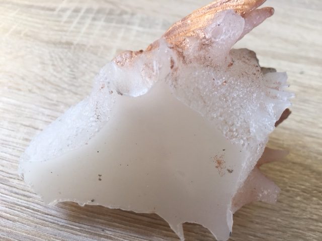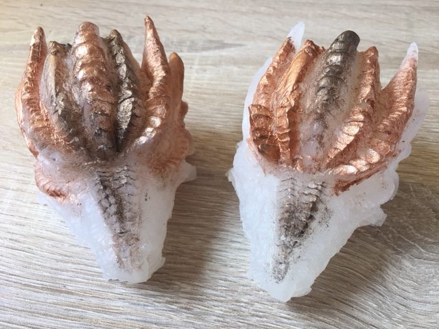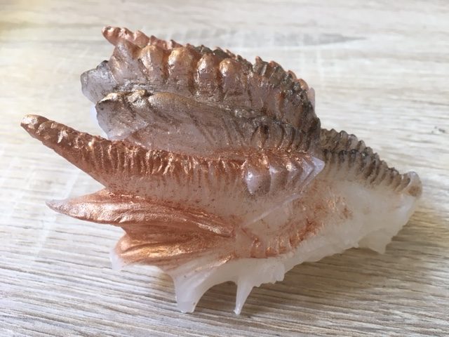 Deze draak is dus niet van Orgonite, want er bevinden zich geen metaalsplinters, krullen of erts-mineralen binnenin het kunsthars, maar alleen wit seleniet.