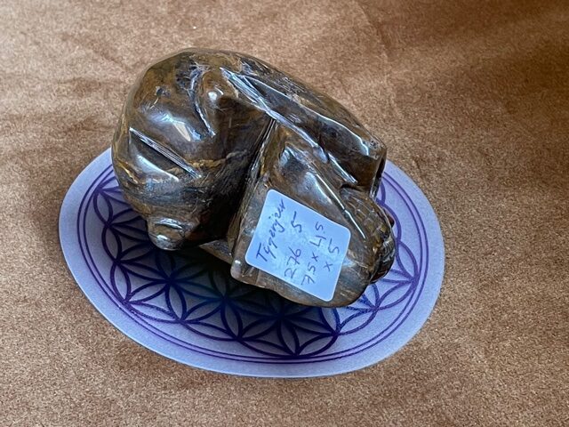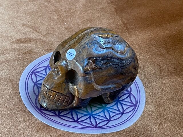 Het is een échte LeMUria Tijger van een skull, welke op uitmuntende wijze kracht, moed, zelfvertrouwen en uithoudingsvermogen geeft. Door de combi van Tijgeroog, Jaspis en Hematiet kwarts versterkt ze de Zonnekracht en Vitaliteit van een mens. Als een ware LeMUriaan kom je tot rust en word je in het centrum van je lichaam getrokken. Een continue straling van levensenergie door je Prana Kanaal bevordert ook de nachtrust en kan als een geleidelijke katalysator helend en stimulerend inwerken op je immuunsysteem. Met name Hematiet in deze krachtige Tijgerijzer Dame zal je gronden, waardoor je met meer zelfvertrouwen de wereld tegemoet durft te treden.