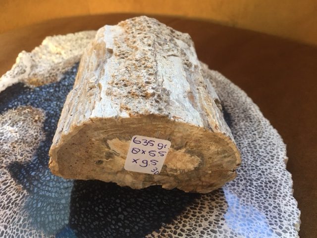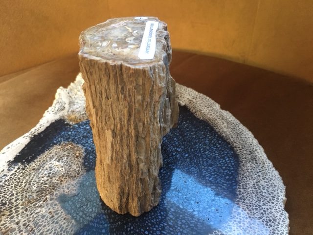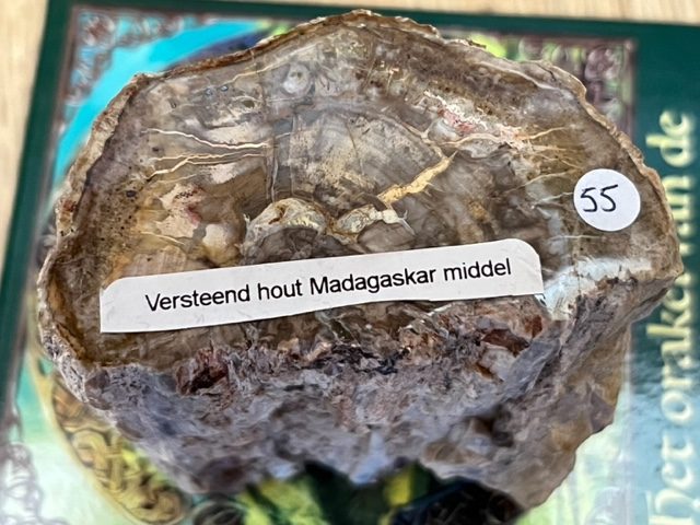 Dit stukje Versteend Houten LeMUria boomstammetje komt uit de grond van Madagaskar. Je ziet haar op de foto staan op een schijf van een versteend houten Palmboom Wortel uit Indonesië.