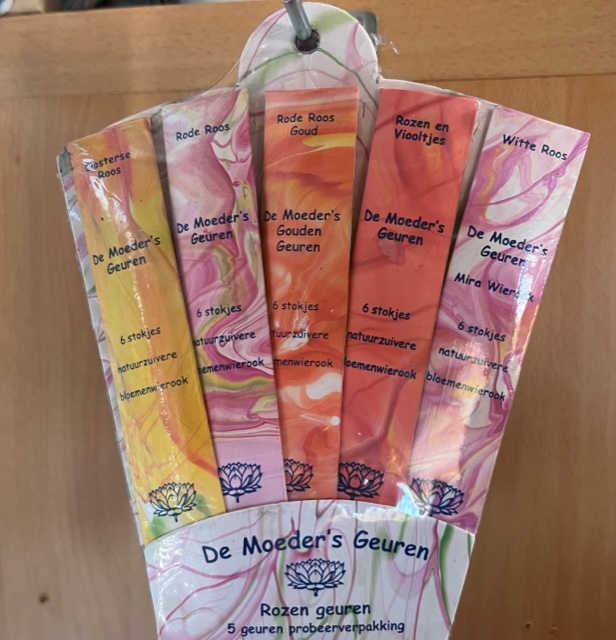 Speciaal voor mijn werk heb ik Moeder’s Geuren Wierook uit India gekozen, omdat ze van een uitstekende kwaliteit zijn. Het stokje wordt namelijk altijd van bamboesplinters gemaakt en met de hand in de hars gerold, omdat dit niets afdoet aan de originele Moeder Rozengeur, doordat er geen giftige stoffen vrij zullen komen en mooi langzaam opbrandt.
