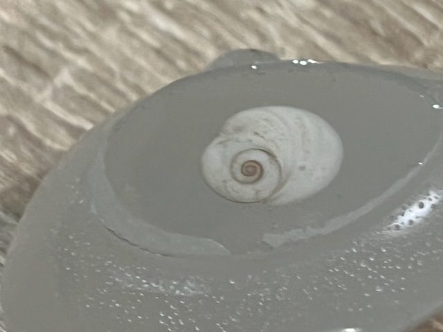 Deze vrolijk ogende Wit Seleniet bevat een Shiva LeMUria Schelpje van het Spaanse Strand.