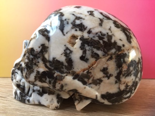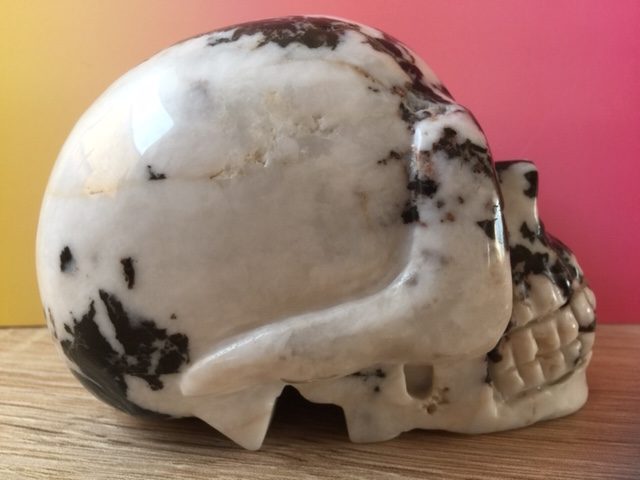 Zebra Jaspis is eigenlijk onmisbaar voor iedereen hier op aarde. Zij verenigt zoveel positieve eigenschappen die op Moeder Aarde ontegenzeggelijk te kort schiet onder de mensheid! Eigenlijk zou ik iedereen aan willen raden om daarom ook een of meerdere kiezelstenen in huis te halen of bij zich te dragen, want zij dragen op meervoudige wijze ook de kwaliteiten in zich mee van deze schitterende Zebra gestreepte wit zwarte Yin Yang gebalanceerde LeMUria Skull.