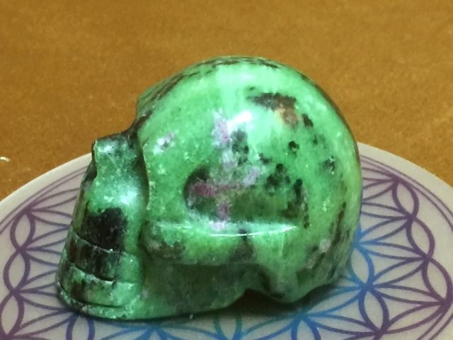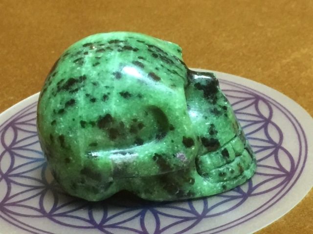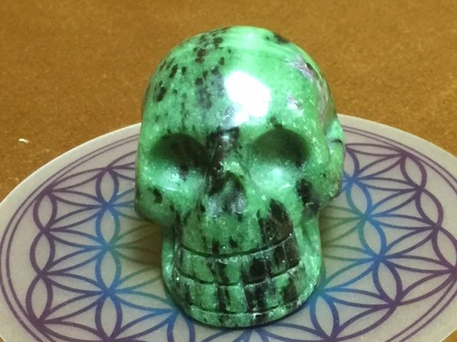 Eigenschappen: De groene zoïsiet en de paarsrode robijn zijn de 2 basis elementen van deze schitterende gevoelige Skull. Met daar doorheen lopend een paar zwarte vlekken van pargasiet, welke op zachte wijze verharde emoties deblokkeert.