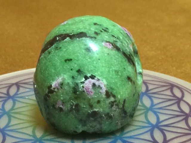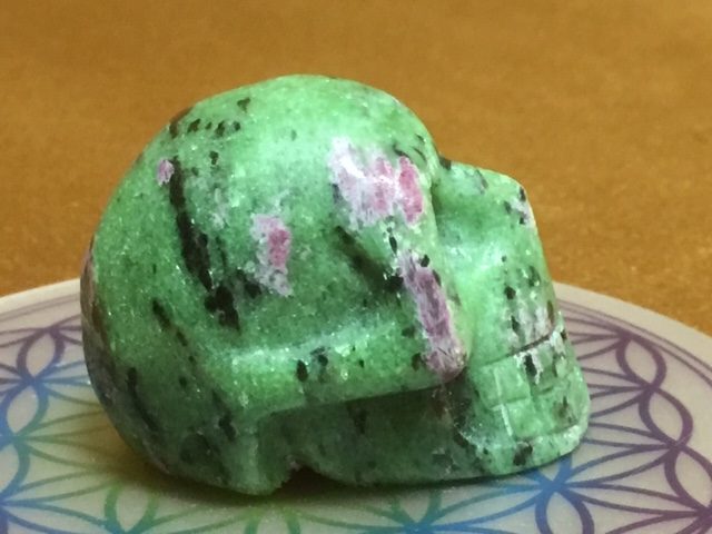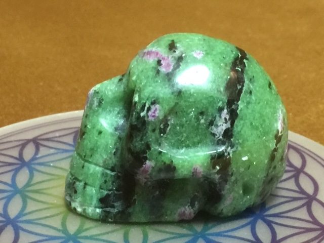 Eigenschappen: De groene zoïsiet en de paarsrode robijn zijn de 2 basis elementen van deze schitterende gevoelige Skull. Met daar doorheen lopend een paar zwarte vlekken van pargasiet, welke op zachte wijze verharde emoties deblokkeert.