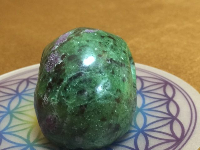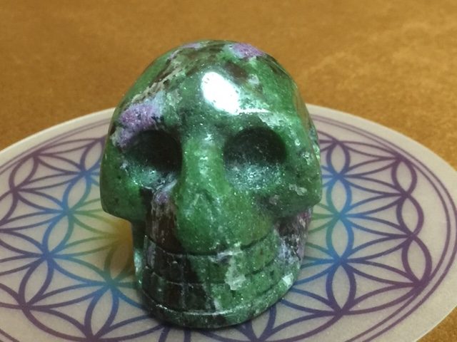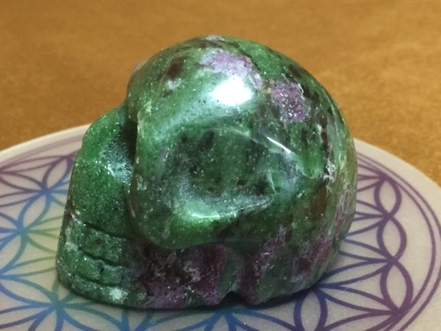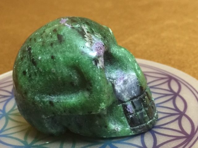 Eigenschappen: De groene zoïsiet en de paarsrode robijn zijn de 2 basis elementen van deze schitterende gevoelige Skull. Met daar doorheen lopend een paar zwarte vlekken van pargasiet, welke op zachte wijze verharde emoties deblokkeert.