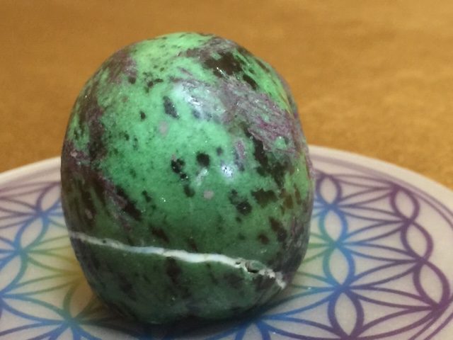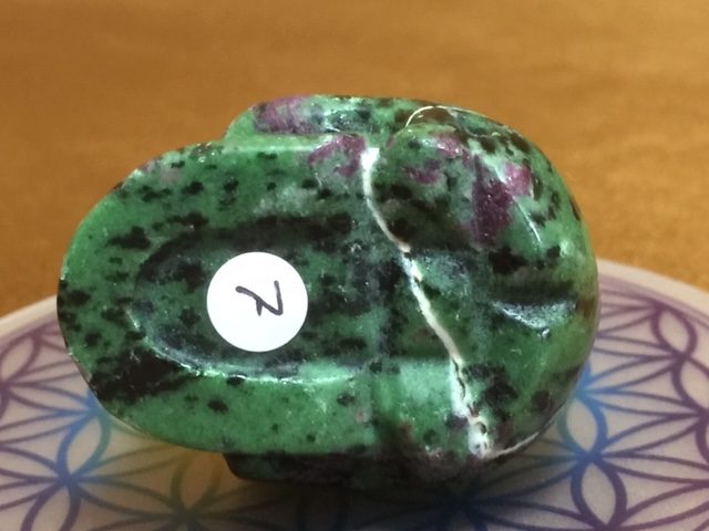 Eigenschappen: De groene zoïsiet en de paarsrode robijn zijn de 2 basis elementen van deze schitterende gevoelige Skull. Met daar doorheen lopend een paar zwarte vlekken van pargasiet, welke op zachte wijze verharde emoties deblokkeert.