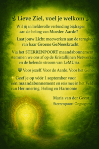 Kom in mijn LichtCirkel – luister, adem, straal ✨ en ervaar hoe ook U onmisbare draden zal gaan weven in dit betoverende Kristalweb van LeMUria door een STERRENPOORT ABONNEMENT te bestellen HIER in categorie 60 van mijn LeMUria Healing Webshop.