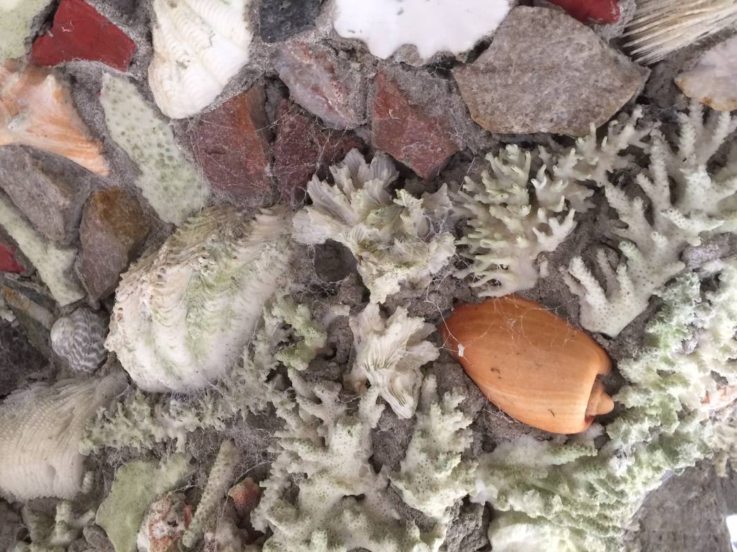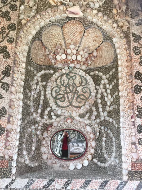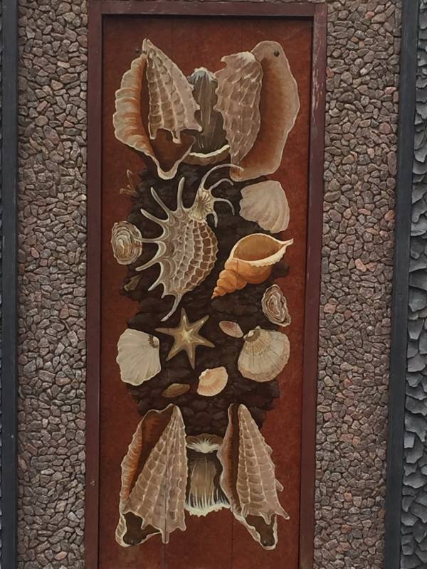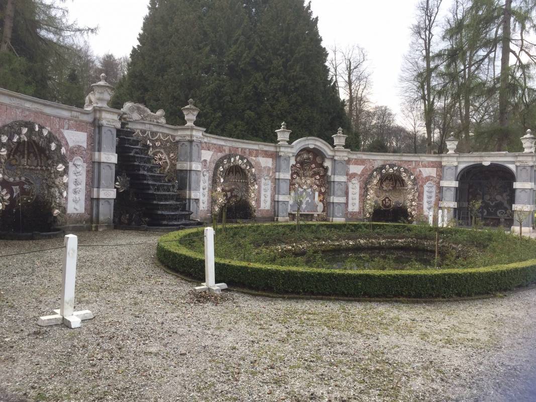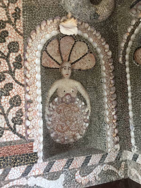 Beneden in het Paleis een Schelpengalerij, maar ook buiten, aan de achterkant van de Paleistuin, liggen enkele schelpen ornamenten uit zicht