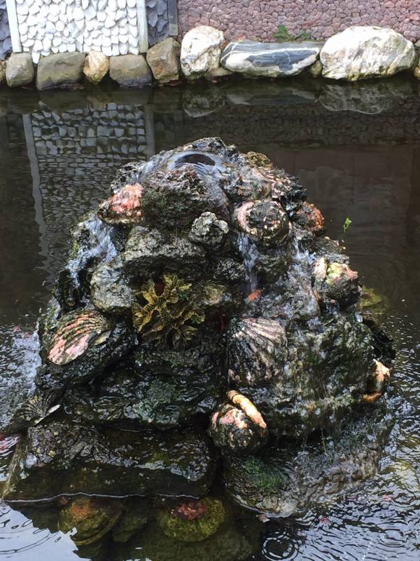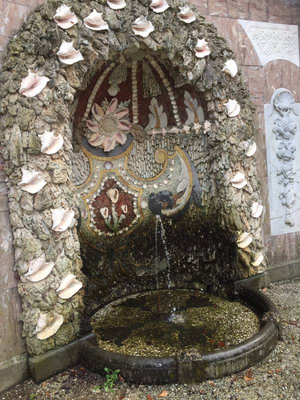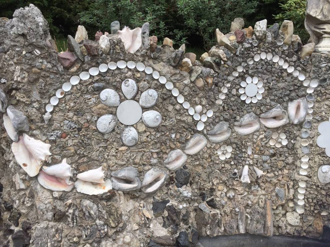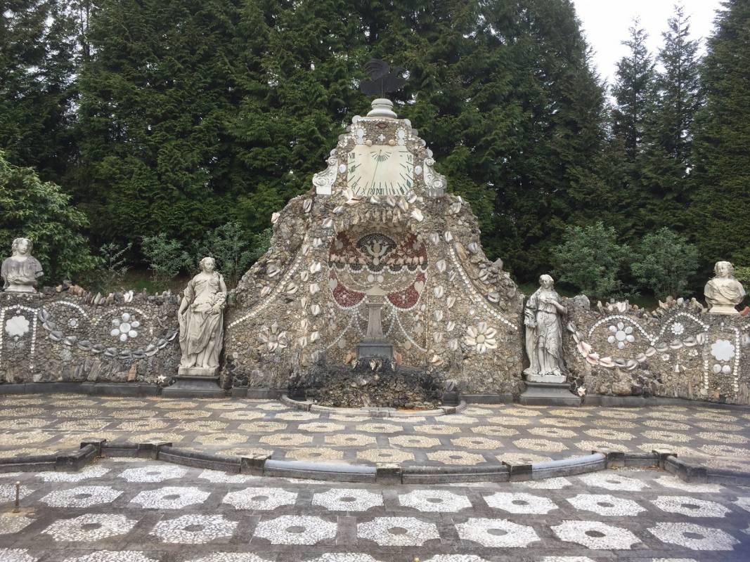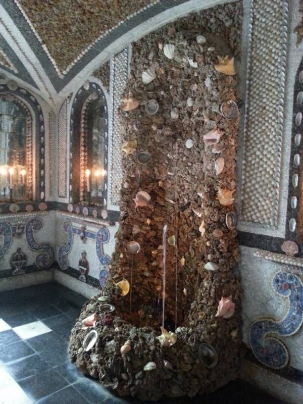 3) Een schelpengalerij onder een kleine waterval tegenover het kasteel. Dit is een kleine waterval die je vanaf het kasteel kan zien liggen. Onder die waterval bevindt zich een holte die met schelpen versierd is. Deze ruimte is een echte schelpengrot, want het lijkt op een natuurlijk gevormde ruimte.