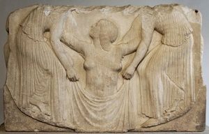 Aphrodite wordt opgevangen door twee dienaressen