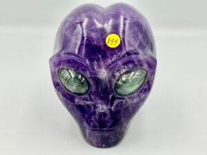 Amethist Alien schedel met Labradoriet ogen L3: 8×6.5×7.5 cm –