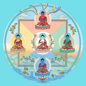 Tibetaanse Boeddhisten zeggen dat de hoogste Adi-Boeddha de vijf Dhyani Boeddha’s heeft gecreëerd via haar meditatieve krachten. De vijf Dhyani Boeddha’s zijn de meest verheven vijf bewustzijnsvelden van Verlichte Boeddha’s die tijdens meditatie kunnen worden aanroepen. Dhyani is afgeleid van het Sanskriet woord dhyana dat ‘Verlichting door meditatie’ betekent. Allen hebben we de opdracht om ons te ontdoen van één van de vijf wereldse Ego gerichte vergiften, waarmee we geboren zijn op Moeder Aarde en die tracht te verhinderen tot ware Verlichting te komen. Boeddhisten zeggen dat de 5 Dhyani Boeddha’s in staat zijn om de vijf gif-aspecten die ons vasthouden aan het materialistische bestaan op Aarde, door meditatie te transformeren naar het bewustzijn van de vijf Dhyani’s, zodat haar ware wijsheid de negatieve krachten zullen verlichten.