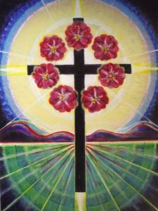 Zie hieronder het symbool van de Rozenkruisers, waarin op het Cross your Heart punt van het Heilige Kruis van (Jezus) Christus, een Cirkel van Rode Rozen gelegd wordt, die symbool staan voor de Terugkeer van de Vrouwelijke Christina in de Harten van iedere bewoner op Moeder Aarde.
