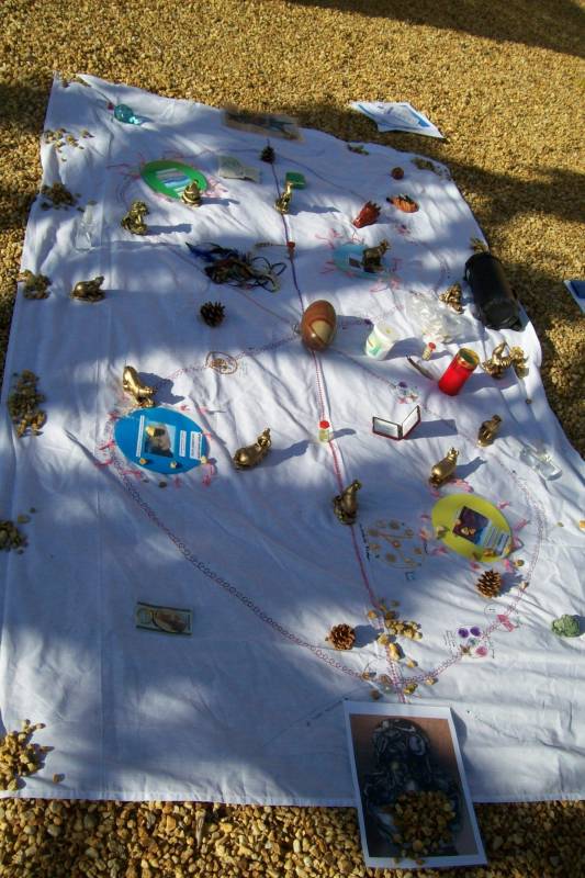 Vooraf legden we een wit laken neer, met daarop getekend de Kwan Yin Lemniscaat Drakinnen waterstroom rond Moeder Aarde, waarop ik ook de 4 grote Elementen Vortexen en 12 HoofdChakra’s had aangegeven. We verbonden ons eerst met de wind, de  zon, het water van de Rijn en Moeder Aarde vooraf door het zingen van aardeheling songs.