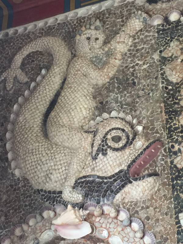 3) Een schelpengalerij onder een kleine waterval tegenover het kasteel. Dit is een kleine waterval die je vanaf het kasteel kan zien liggen. Onder die waterval bevindt zich een holte die met schelpen versierd is. Deze ruimte is een echte schelpengrot, want het lijkt op een natuurlijk gevormde ruimte.