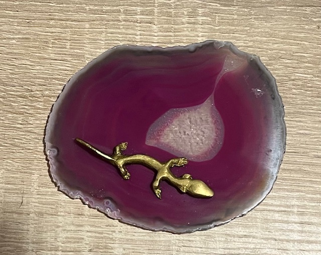 Deze zeldzame Messing Olm, op een Rood-Roze Agaat gelijmd, heb ik bij de ingang van de MoederGrotten van Postojna gekocht in de kristalwinkel van de eigenares. De steen bevat geheime LeMUria Codes en voelde voor mij direct als een stukje thuiskomen.
